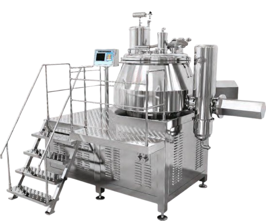 • MAIN IMPELLER & DRIVE: The main impeller consists of dual speed 750/5000 synchronous dual HP TEFC motor, coupled through a belt drive to a worm reduction gearbox with chain coupling. The impeller is designed to provide mixing at the bottom and at the centre of the bowl and is driven through a specially designed bearing housing that facilities inside wash facility for quick change over and also prevents leakage of powder from bottom entry and leads to longer life of gear box.